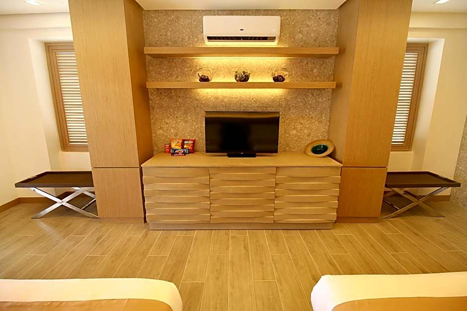 Equipped with 2 double size beds, desk and chair, air conditioning, private bathroom with hot and cold shower, bath amenities, towels, bathrobes, LED cable TV, mini-bar, safety box, telephone, coffee maker, hairdryer, free WiFi access and a veranda.